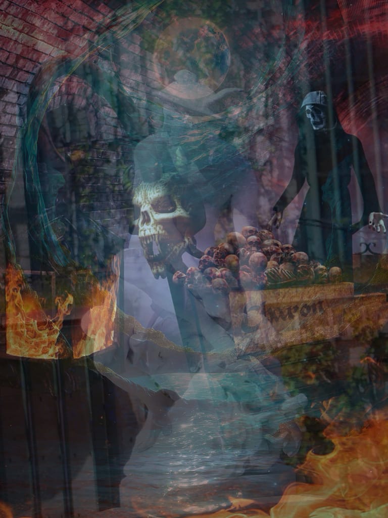 „Hermes geleitet die Seelen zu dem Fährmann Charon, der sie zur Unterwelt über die Styx, einen Fluss, hinüberfährt. Voraussetzung dafür ist eine ordnungsgemäße Bestattung und eine Münze zwischen den Zähnen, mit der Charon bezahlt wird. Geschah dies nicht, sind die Seelen dazu verdammt, 100 Jahre am Ufer zu warten, ehe sie hinübergefahren werden können. Cerberus, ein dreiköpfiger Unterweltshund, bewacht nun den Eingang zur Unterwelt, den kein Sterblicher mehr verlassen kann, außer er führt einen goldenen Zweig als Eintrittskarte mit sich. Das Betreten der Unterwelt hingegen gelingt einem Sterblichen quasi immer, vorausgesetzt er gibt Cerberus Honigkuchen zu essen.“