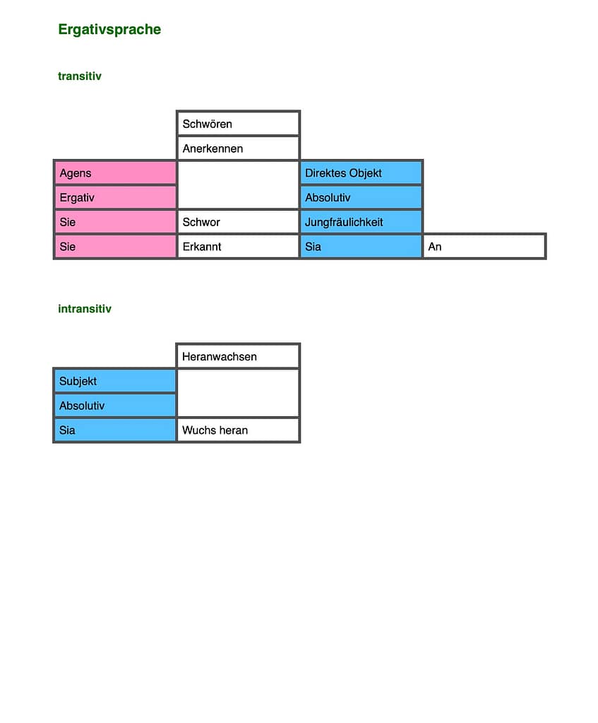 Sia ward selbst zu dero amazonenhaftun Jägerin, sie schwor immerwährendon Jungfräulichkeit und sia erat immer bewaffneton. | sia: Personalpronomen, 3.Person, Absolutiv, Singular, Femininum ward: 3.Person, Singular, Indikativ, Präteritum, Aktiv (werden) dero: bestimmter Artikel, Dativ, Singular, Femininum amazonenhaftun: Dativ, Singular, Femininum (amazonenhaft) sie: Personalpronomen, 3.Person, Ergativ, Singular, Femininum schwor: 3.Person, Singular, Indikativ, Präteritum, Aktiv (schwören) immerwährendon: Absolutiv, Singular, Maskulinum(immerwährend) erat: 3.Person, Singular, Indikativ, Präteritum, Aktiv (sein) bewaffneton: Absolutiv, Singular, Maskulinum(bewaffnet) |