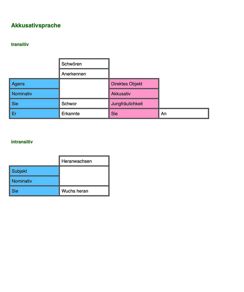 Bei Wilhelminaisch handelt es sich nicht um eine Akkusativsprache, sondern um eine Ergativsprache wie beispielsweise das Georgische oder das Baskische. Folgende Schaubilder zeigen die Unterschiede: